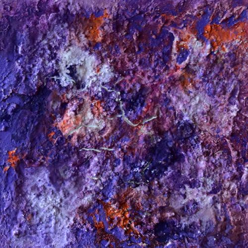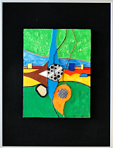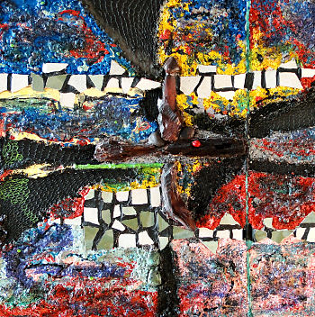 Material: Hartfaserplatte auf Holzrahmen, Acrylspachtel, Kies, Keramikbruch, Nylonnetz, Acrylfarben